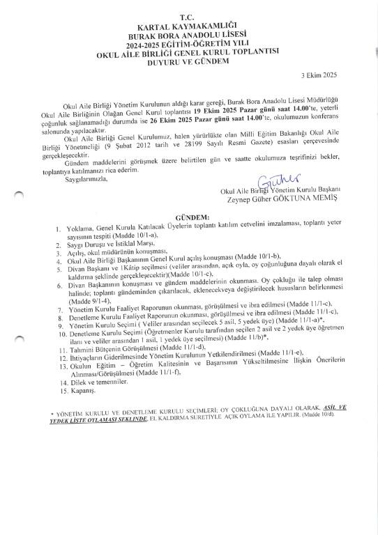 Okul aile birliği yönetim kurulunun 30.09.2025 tarih ve 45 nolu kararı ile 2025-2026 eğitim öğretim yılı okul aile birliği genel kurul toplantısı kararı alınmış olup, genel kurul duyurusu 30.09.2025 tarihinde okul panolarına asılmıştır. Genel kurulu duyurusu aşağıda bilgilerinize sunulur.